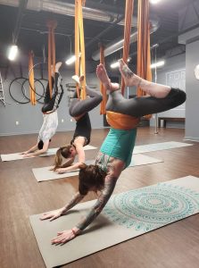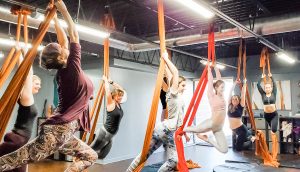 Aerial Yoga is the movement in this class.  We combine the physical practice of yoga with elements of acrobatics through the use of a fabric apparatus that hangs like a hammock, aka aerial hammock or aerial sling.  Our shiny fabrics are a low-stretch 100% polyester tricot material, great for the basic movements in our HANG class, to inverts and combos in the DANGLE class, or for the more advanced movements with drops and flips in our FLOAT classes.
