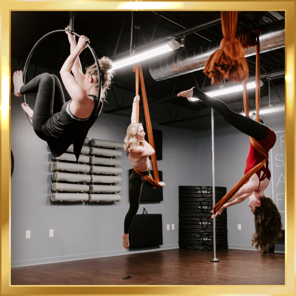 We provide instruction and training on multiple apparatuses: including, but not limited to Aerial Yoga, Silks, Lyra and Pole Fitness. We provide an assortment of grounded classes, including yoga, chair, and floorcraft classes, and specialty workshops, including AcroYoga, POUND, Double Trouble, Twerk, Lollipop Lyra, Holiday, and so much more!